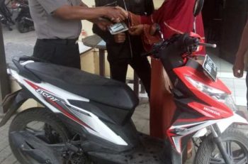 Tegal – Warga melaporkan tentang adanya sepeda motor misterius jenis Beat warna merah putih bernomor polisi G 2301AEG yang berada di sebelah timur SPBU Purwahamba Kecamatan Suradadi Kabupaten Tegal. Atas penemuan motor di bengkel milik Agus Nurochim (40) itu, petugas Polsek Suradadi yang menerima laporan langsung menindaklanjuti.