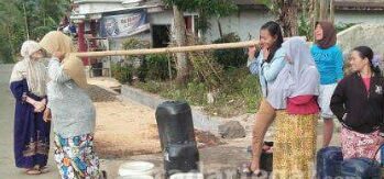 Warga harus rela mengantre di tempat penampungan air yang berasal dari sumber mata air. Memasuki musim kemarau, sumber mata air semakin berkurang debitnya sehingga aliran air sedikit.