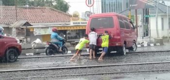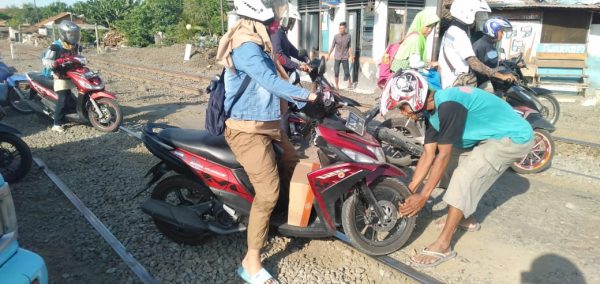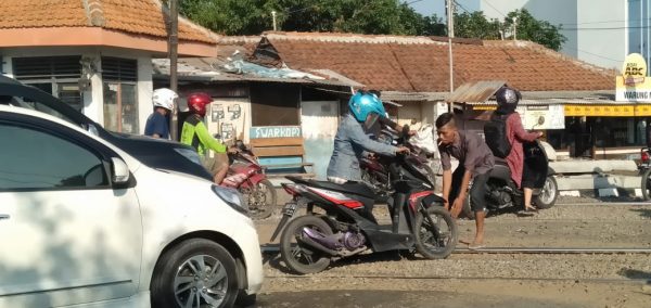 Tegal – Akibat kondisi turunan dari rel kereta api (opritan) terlalu tinggi, membuat banyak kendaraan roda dua tergelincir. Bahkan roda empat yang melintas juga mengalami hal yang sama.