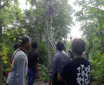 Purbalingga – Anggota Polsek Karangmoncol Polres Purbalingga bersama warga melakukan evakuasi seorang warga yang tewas saat memanjat pohon di Desa Tajug, Kecamatan Karangmoncol, Kabupaten Purbalingga, Minggu (6/1/2019) sore.