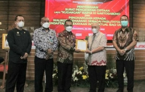 Surat Pencatatan Ciptaan atas karya tersebut diserahkan Kepala Kanwil Kemenkumham Jateng A. Yuspahruddin kepada pemegang hak cipta lagu “Kudangan” Jarot Sabdhono, anak kandung Ki Nartosabdho, Kamis (30/12/2021).