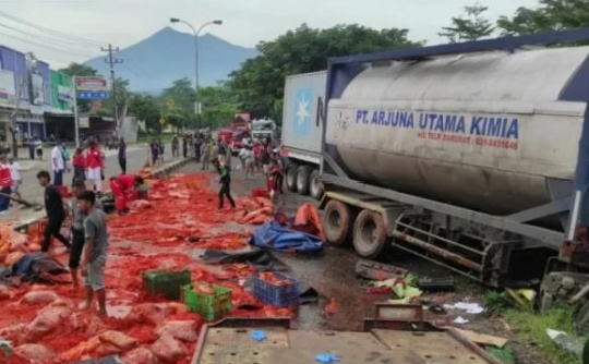 Truk tangki yang melaju tidak terkendali kemudian menabrak satu truk kontainer dan sepeda motor.