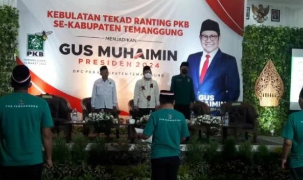 Temanggung – Ratusan kader ranting Partai Kebangkitan Bangsa (PKB) se-Kabupaten Temanggung, Jawa Tengah, membulatkan tekad untuk mendeklarasikan Ketua Umum DPP PKB Muhaimin Iskandar sebagai Calon Presiden 2024 di Gedung Joeang 45 Kabupaten Temanggung, Minggu.