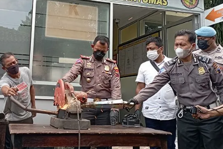 Pemusnahan dilakukan dengan cara memotong knalpot “brong” tersebut menjadi dua bagian dengan menggunakan gergaji mesin di halaman Markas Polresta Banyumas, Purwokerto, Kabupaten Banyumas, Selasa.