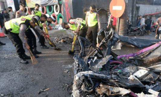Polisi membersihkan puing-puing di lokasi kecelakaan di Kertek, Wonosobo.