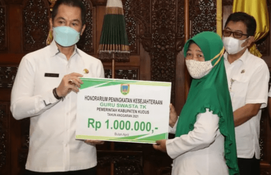 Program tunjangan kesejahteraan guru swasta di Kabupaten Kudus merupakan janji kampanye pasangan Tamzil-Hartopo dengan nominal penerimaan awal masing-masing guru sebesar Rp1 juta per bulannya.