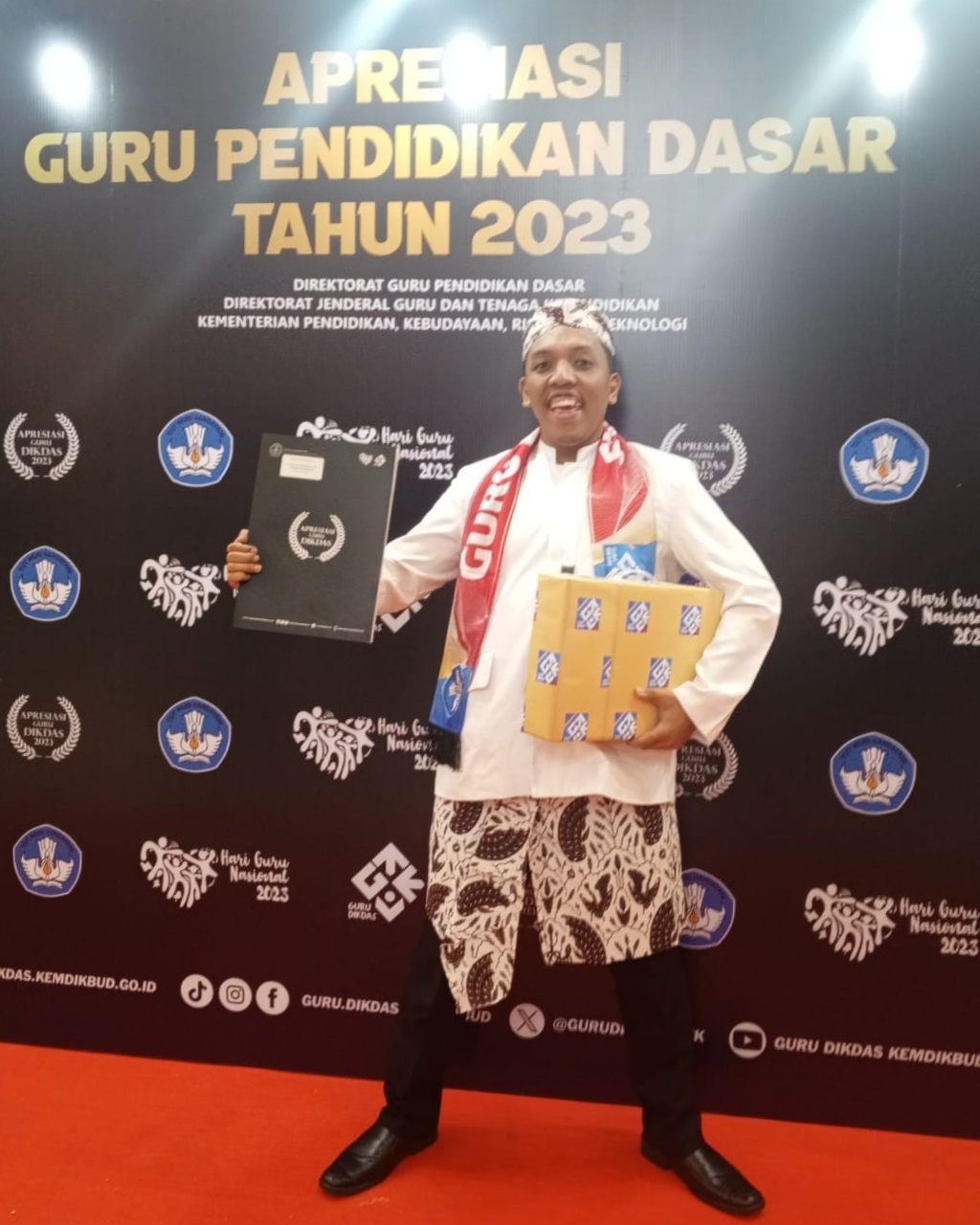Guru berprestasi tersebut bernama Slamet Hari Pambudi menerima penghargaan sebagai juara 1 Apresiasi Guru dan Tenaga Kependidikan tahun 2023 kategori GTK Inovatif Guru Sekolah Dasar dalam Rangka Hari Guru Nasional Tahun 2023 di Jakarta, Jum’at (24/11).
