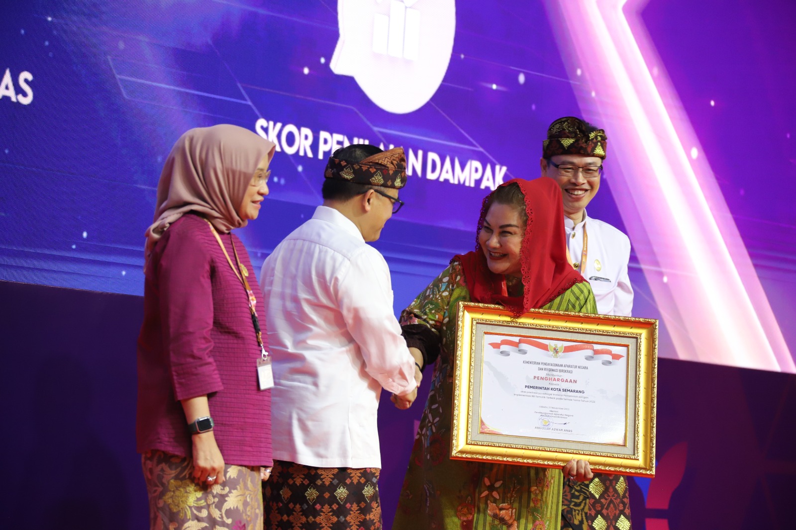 Wali Kota Semarang Hevearita Gunaryanti Rahayu menerima penghargaan kategori Instansi Pemerintah dengan Implementasi Reformasi Birokrasi (RB) Tematik terbaik pada semua tema tahun 2023. Penghargaan dari KemenPAN RB diterima di Bali Nusa Dua Convention Center, Rabu (6/12).