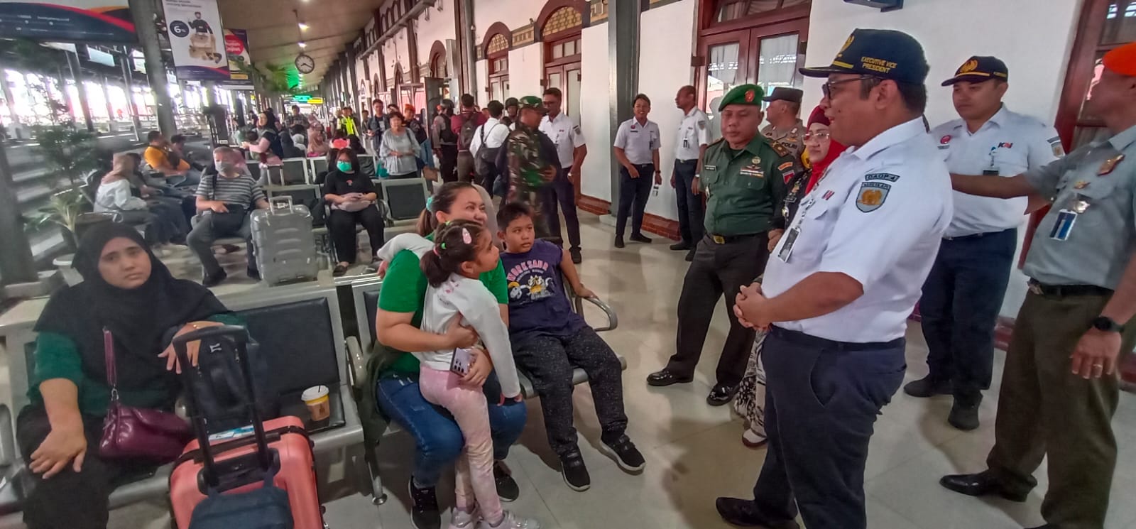 Kepala KAI Daop 4 Semarang Daniel Johannes Hutabarat dan petugas gabungan menyapa penumpang, sekaligus mengecek pelayanan di Stasiun Tawang Semarang hadapi libur Nataru. (Foto: Gus Djoyo)
