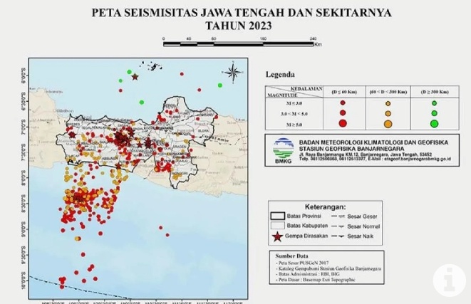 Banjarnegara – Stasiun Geofisika Badan Meteorologi Klimatologi dan Geofisika (BMKG) Banjarnegara mencatat sebanyak 601 kejadian gempa bumi di Jawa Tengah pada periode 1 Januari hingga 27 Desember 2023.