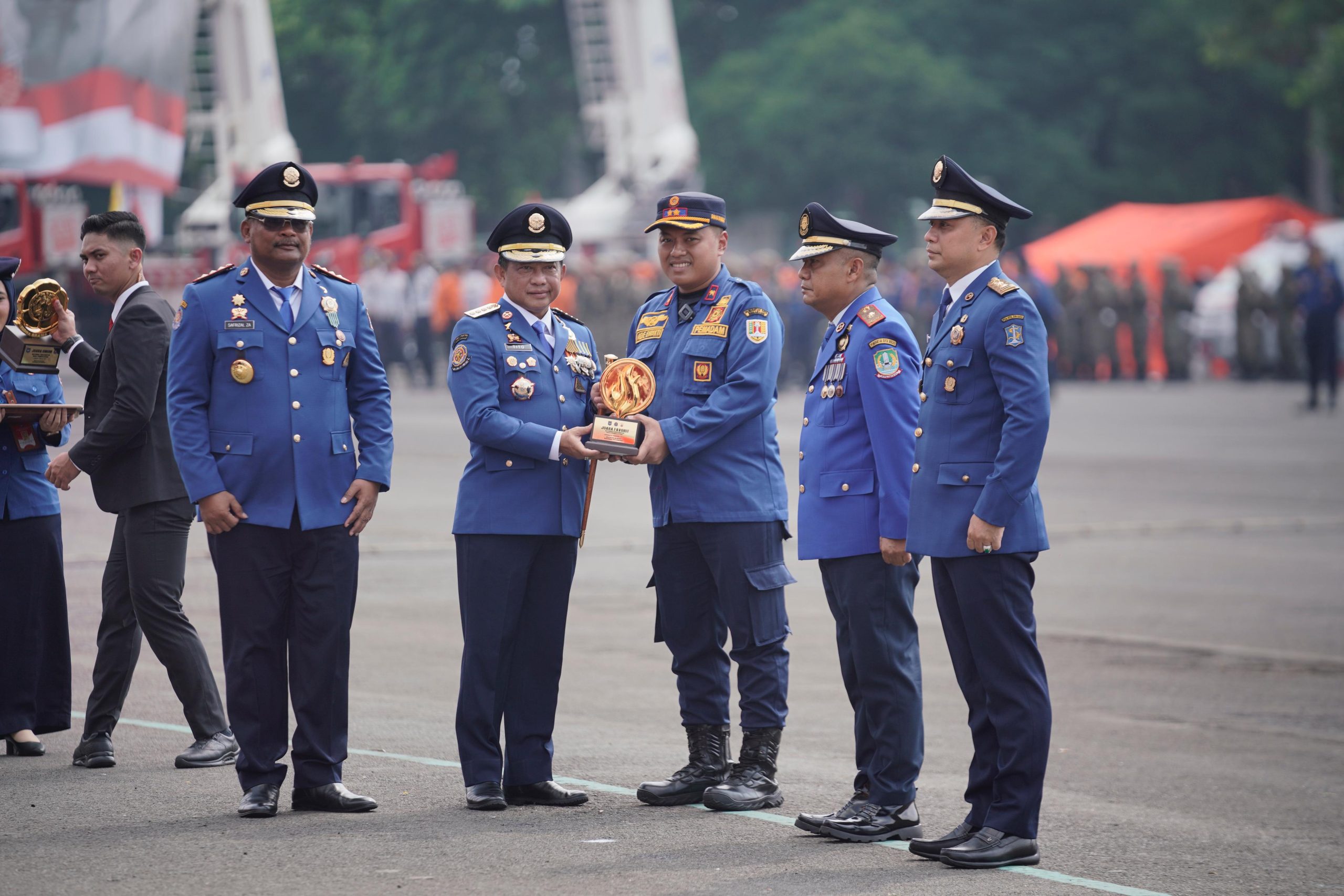 Sekretaris Dinas Damkar Kota Semarang Ade Bhakti menerima piala dari Mendagri Tito Karnavian. Damkar Kota Semarang menyabet 2 juara di ajang NFSC 2024 dalam rangka HUT Damkar ke-105 di Surabaya. (Foto: Dok)
