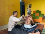 Dengan penuh kesabaran, Aiptu Maryono membimbing puluhan anak santri membaca Al-Qur’an.