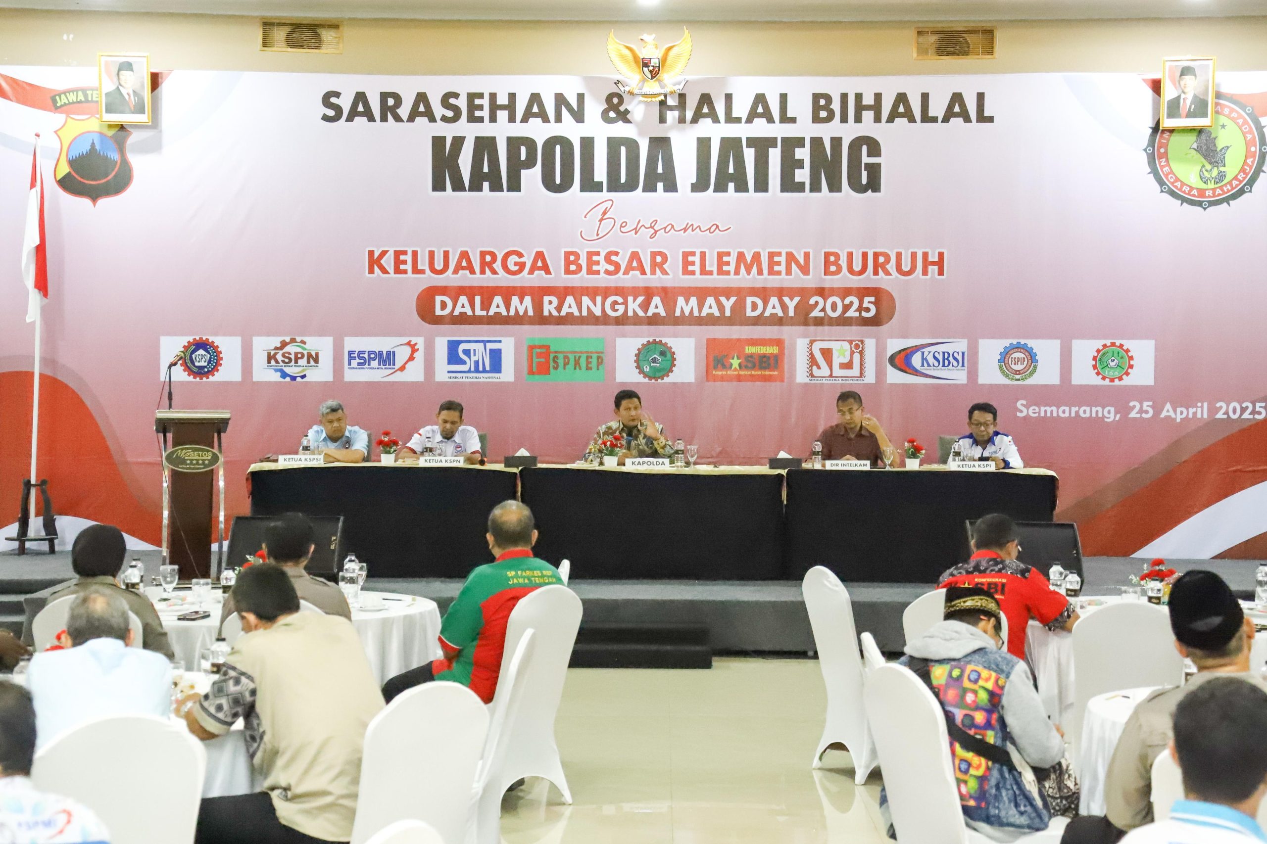 Semarang – INFOPlus. Menyambut peringatan Hari Buruh Internasional atau May Day 2025, Polda Jawa Tengah menggelar kegiatan sarasehan dan halal bihalal bersama perwakilan serikat buruh/pekerja se-Jawa Tengah (25/04) bertempat di Ruang D’ATRIUM Lantai 5 Hotel MG Setos, Kota Semarang.